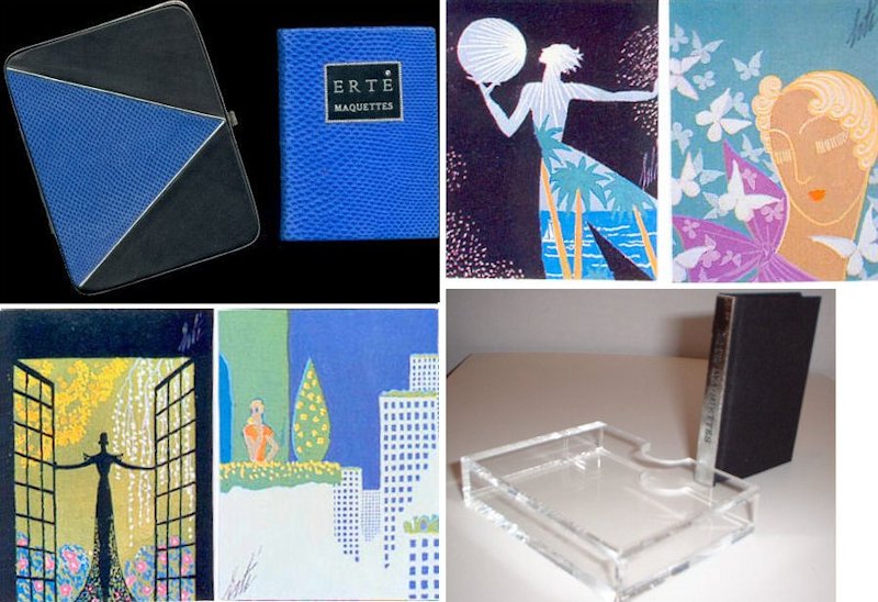 Some background: When Erté was designing covers for Harper’s Bazar his practice was to create 4 or 5 different designs for consideration. These “maquettes” were done in a small scale, perhaps 5 inches high. Once a design was selected, it was rendered in full size and in full detail. So of every 5 designs, only one would actually be published. Erté kept all of the maquettes and it was these tiny pieces of art that were offered to me for my book. Eventually, I selected 44 illustrations to be produced in full color. I designed two bindings for the book. The regular edition was bound in black silk with silver leather on the spine. The more opulent deluxe edition was bound in cobalt blue snakeskin inlaid with black calf, seed pearls, and a diamond. It was housed in a special box made of sterling silver, black and silver calf, and the cobalt snakeskin, with a black tassel. Erté agreed to sign the deluxe copies.