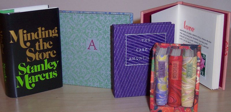 Other books in this photo: Next to Minding the Store is the text of a 1921 essay on the history of the alphabet. It is decorated with printer’s ornaments arranged in various configurations. The cover of the book is cloth that has been printed with a pattern of printers’ ornaments. In purple is The Cask of Amontillado, Poe’s classic story, as published by Bromer Booksellers — one of the best-known bookstores and proponents of miniature books in the world. In front is a 3-volume set of books, focusing on shoes, hats, and bags. Each book is an alphabet, featuring terminology related to the subject matter. Each book is bound in a different marbled paper. Delightfully illustrated.