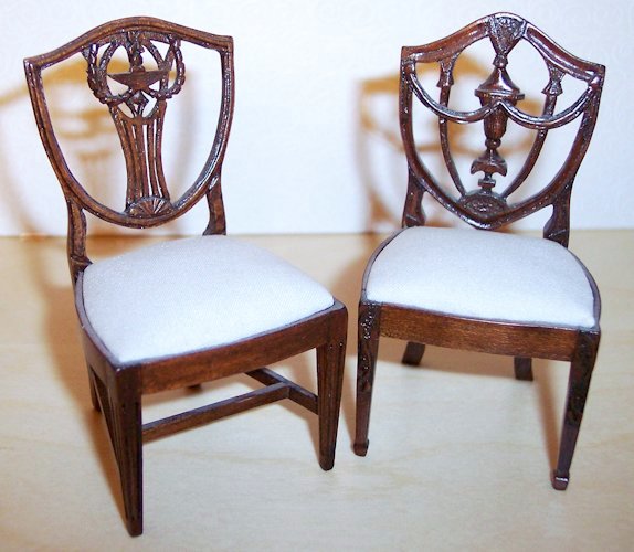 Elaborate Hepplewhite shield-back chairs by Lou Murter feature urns and garlands.