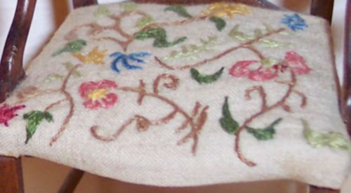 Detail of the hand-embroidered crewel embroidery on the fretwork chair.