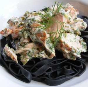 Tasty black foods: licorice, black tagliatelle pasta, caviar, blackberries, truffles, mussels, garlic, olives, grapes.
