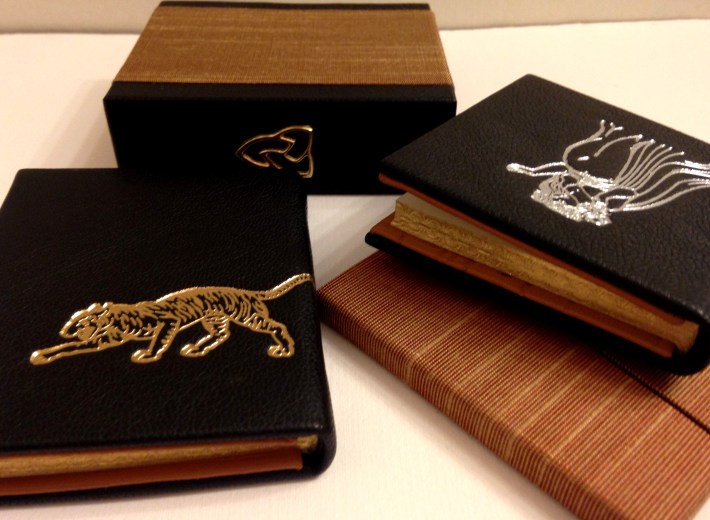 Book bound in black split French goat, stamped in silver and gold.