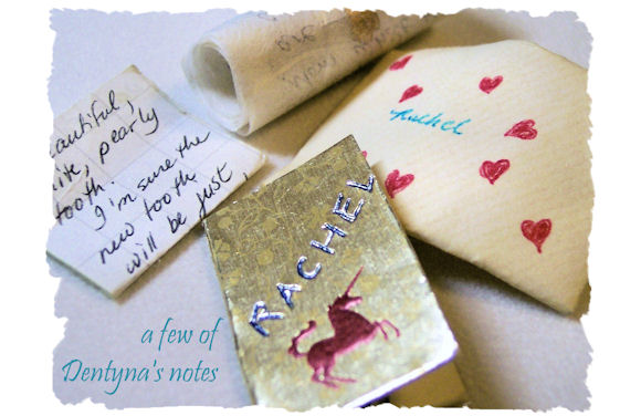 Two months later, her next-to-last baby tooth fell out. Although she didn’t put it under her pillow, in the morning there was a special letter and tiny present from me-Dentyna.