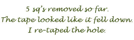 And so the merry men of Abracadabra Squirrels: We Make ‘Em Disappear (not their real name) entered my life — and not a moment too soon. I had been waging my own war on the invaders: taking my electric broom to the ceiling and running it under all the places where I heard them setting up their little Barcaloungers. After awhile, I would lie in wait for them, “weapon” at the ready. At the first hint of sound I would bang the ceiling, then turn it on, shrieking “take that, you miserable squirrel!” On at least one occasion, I feel pretty sure that the noise was actually Chris checking the traps. When I saw him on the following day, he stood as far away as he could manage within the bounds of politeness and he didn’t quite meet my eyes. It was probably my imagination that he looked a little nervous.After three weeks, things were winding down. I hadn’t heard noises in a couple of days, despite evidence that we were clearly still on the drive-by list. All that was left was to patch the hole (full disclosure: a piggy bank was harmed in the accomplishment of that goal) and to bid a grateful farewell to the Squirrel Squad.