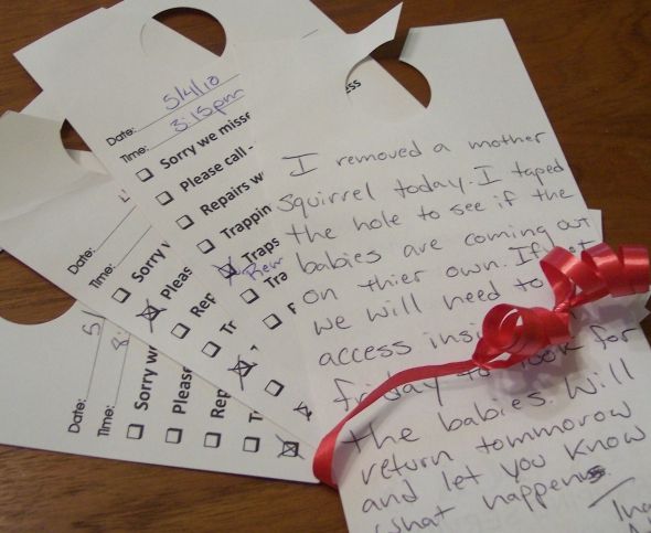 So read the latest missive from Chris, “my guy” at the trapping service [yes, of course humane] I engaged to remove the wildlife from my attic. Our relationship, which lasted 3 weeks, punctuated my days with high and low points, depending on the news contained in his short communiqués. The information in that note was about even. Bad news: I’d had 5 squirrels that we knew of in my attic. Good news: I now had 5 squirrels fewer in my attic. The low points were this terse note:Followed by the still more terse: